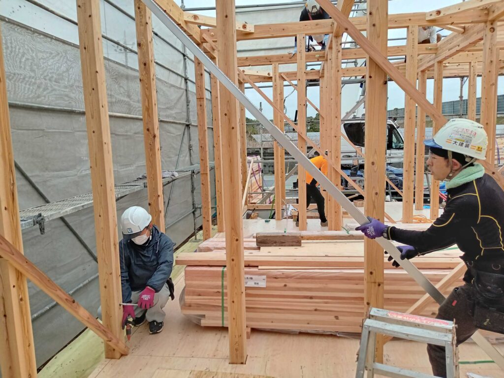 施主様が住まわれた時に、少しでも快適な時間を過ごしていただけるよう、棟上げの現場では、大工さんたちの技が光ります!