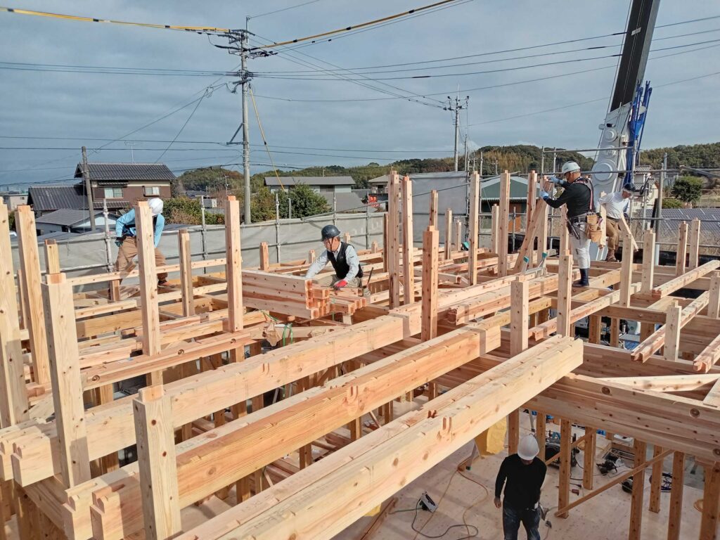 T様邸は平屋になりますので、1階の柱、梁の施工が終わると小屋組みに進みます!