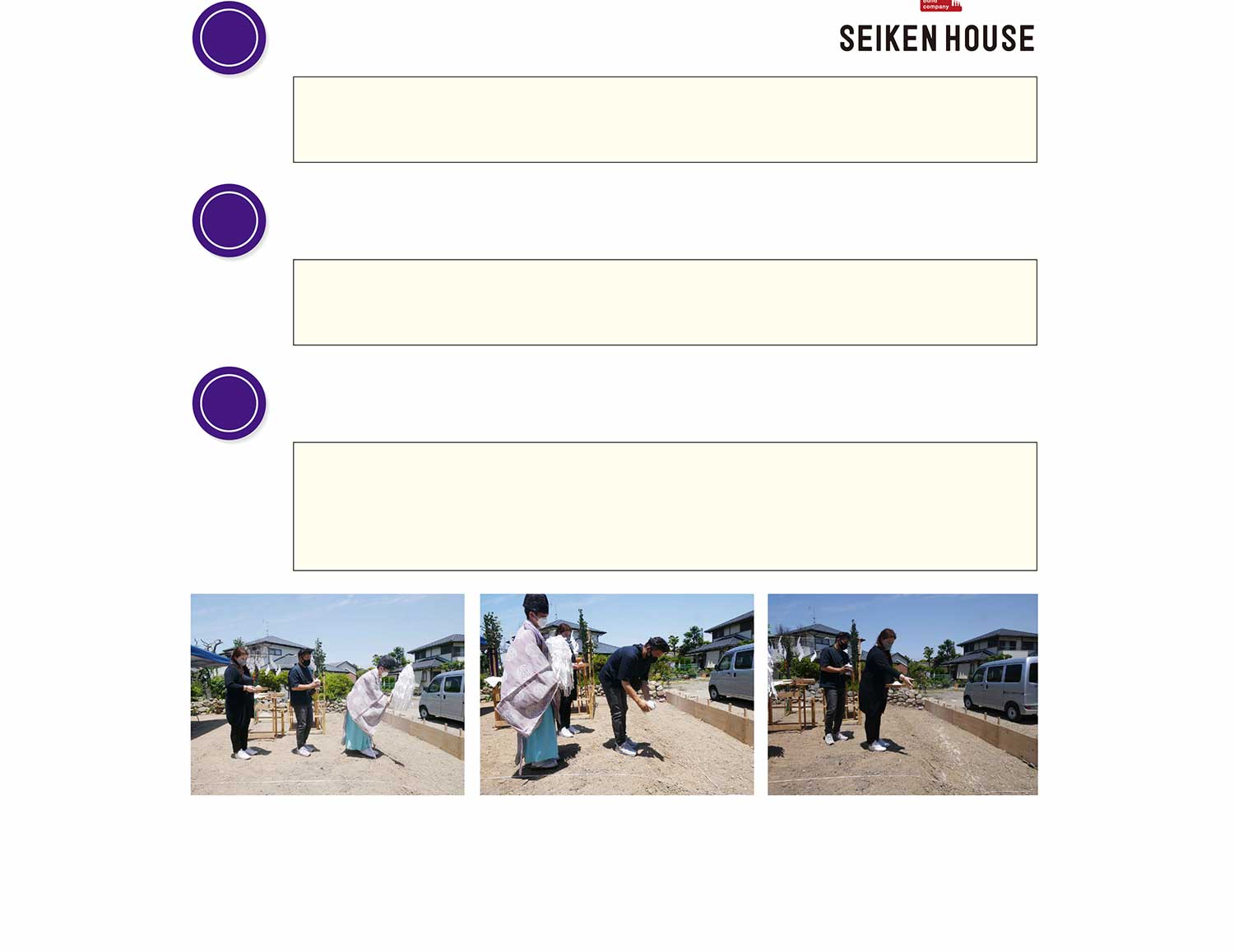 また、地鎮(じちん)とは地鎮(とこしずめ)とも言い、米・塩・切麻(きりぬさ)を土地の四方に散供(さんく)し、忌鎌(いみかま)、忌鍬(いみくわ)、忌鋤(いみすき)により刈初(かりぞめ)、穿初(うがちぞめ)を行い、鎮物(しずめもの)を埋納(まいのう)して土地の神霊を和め鎮めるために行うのでセイケンハウスでは家づくりに大切と考えているのです。
