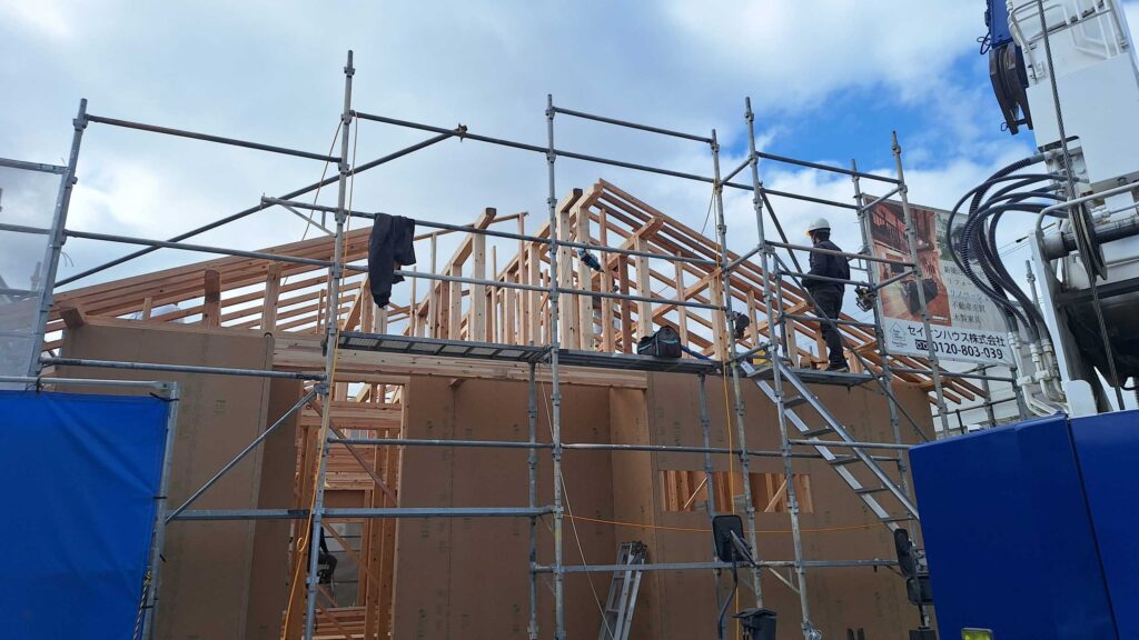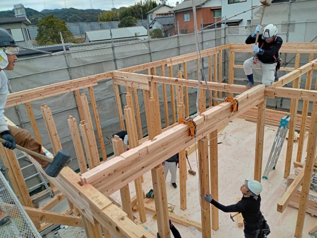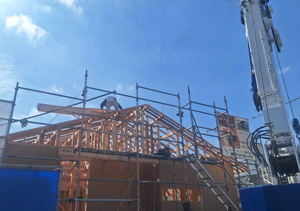 施主様が住まわれた時に、少しでも快適な時間を過ごしていただけるよう、棟上げの現場では、大工さんたちの技が光ります!