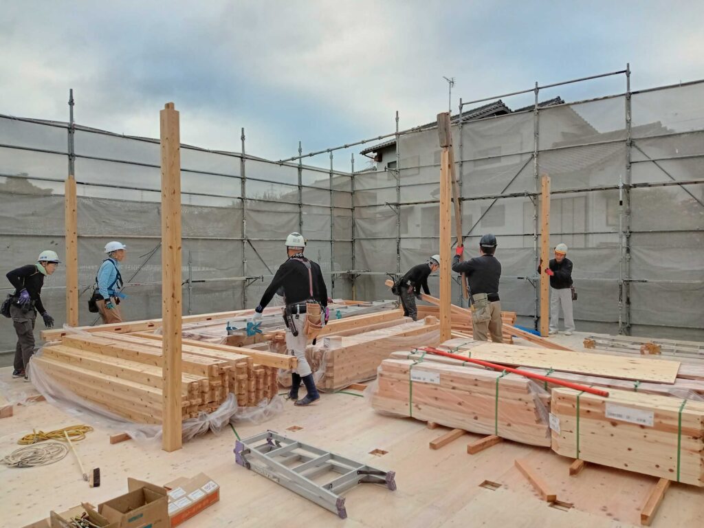 T様邸は平屋になりますので、1階の柱、梁の施工が終わると小屋組みに進みます!