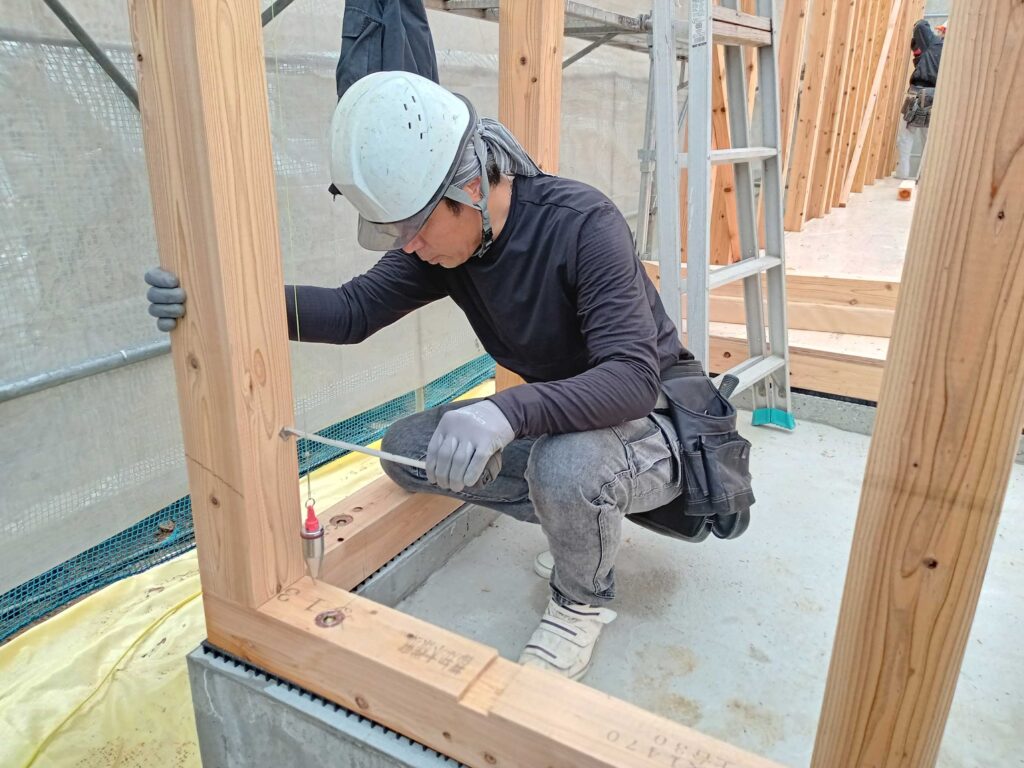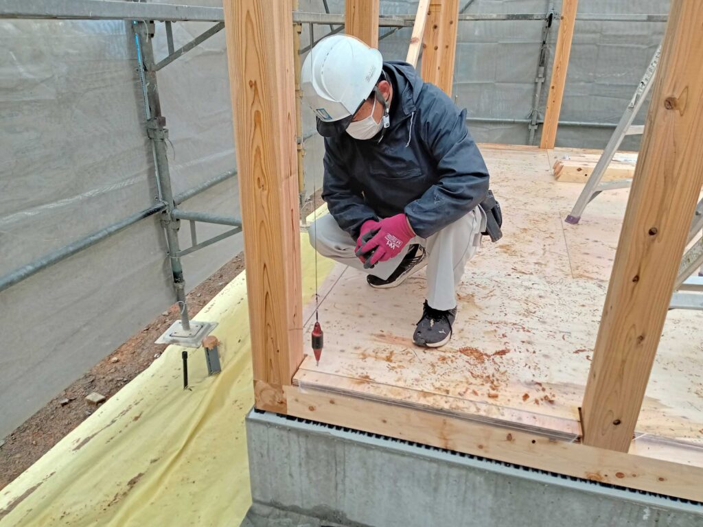 そして、1階の柱に歪みが無いか、大工さんたちが「下げ振り」を用いて確認します!