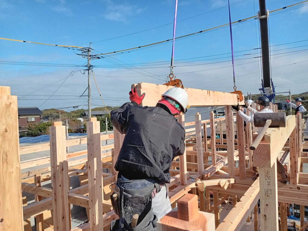 クレーンで持ち上げた大きな横架材を、大工さんが力と気持ちを込めて、打ち込みます!