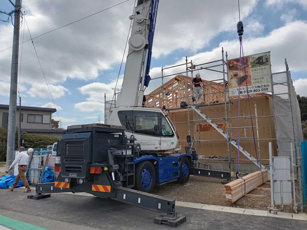 クレーンを使うと、難なく部材を運び入れることができるので、作業効率が上がりますね♪