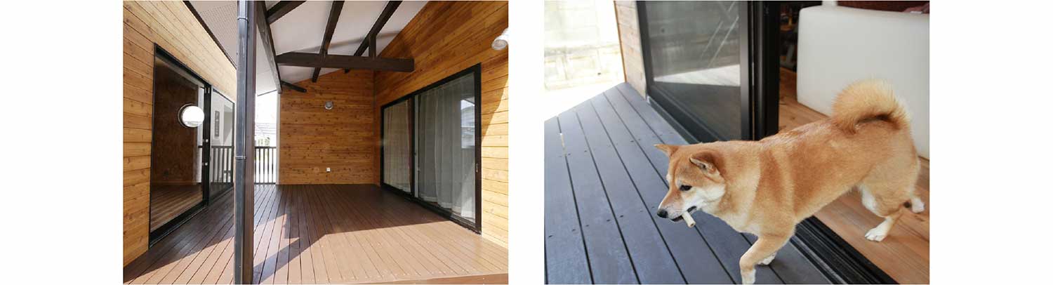愛犬のグルーミングには家の内と外をつなぐウッドデッキが便利です。なかなか散歩から帰りたくない愛犬とのコミュニケーションをとりながら、部屋へと入れる動作が簡単になります。