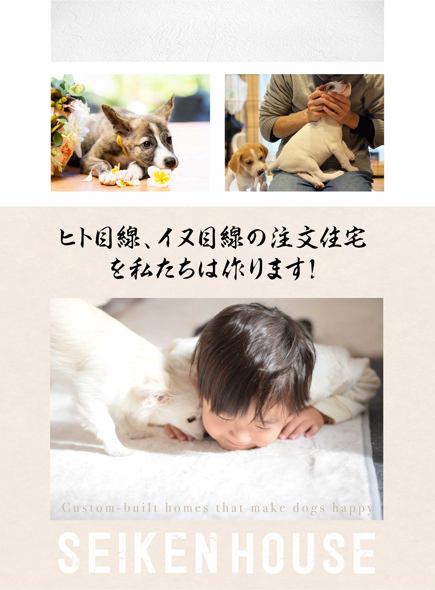 犬と言っても大型から小型まで様々ですので、愛犬にあったサイズの空間を自由に作ることがセイケンハウスの注文住宅なら可能です。ぜひ、お気軽にご相談ください。