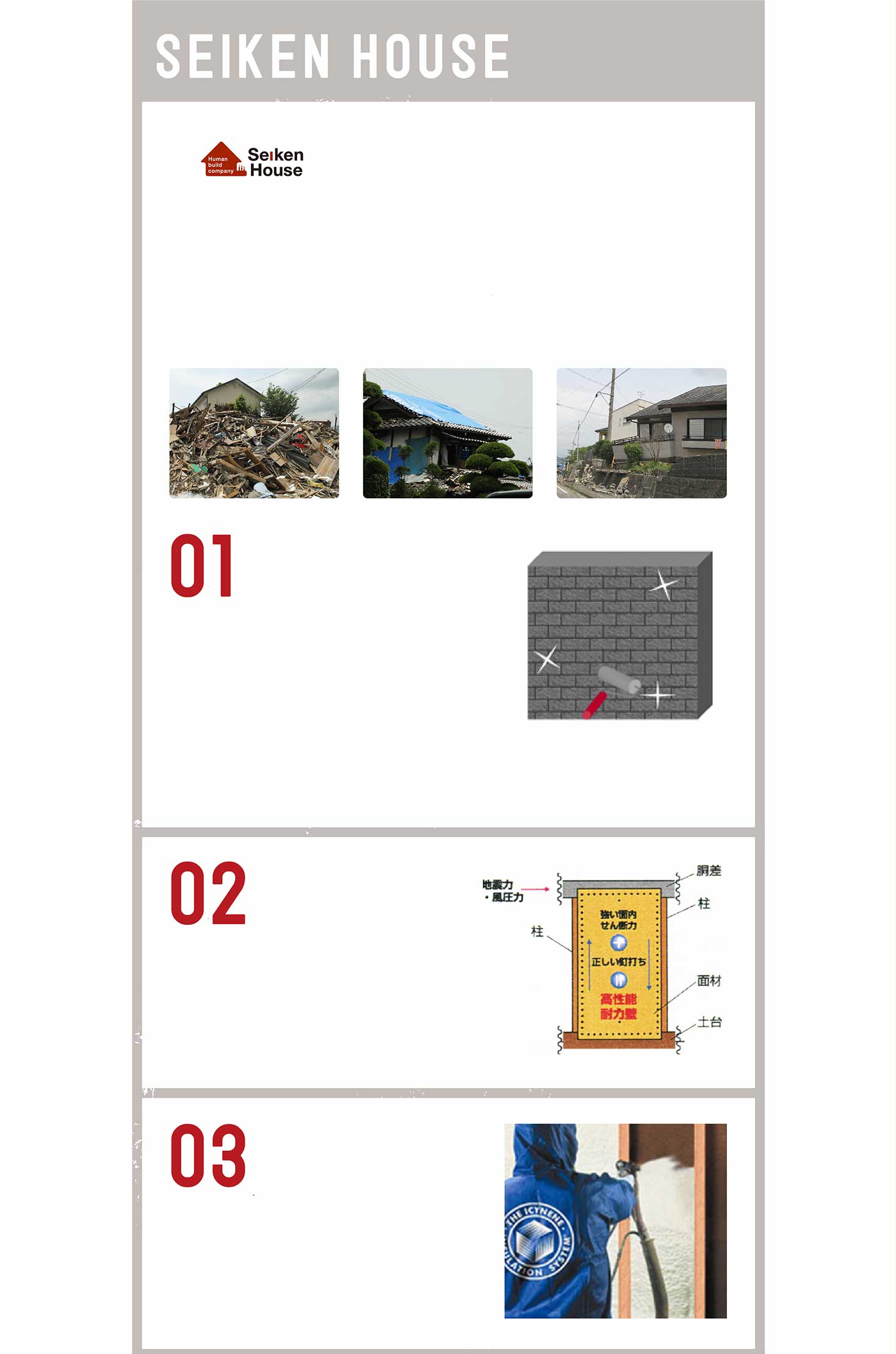 2階から落としても割れない程の強度。基礎工事の「ホームメイキャップ塗装」を採用。外観の美観を整えるだけでなく、コンクリートの中性化を実現。地震などの外力による破壊を防ぎます。