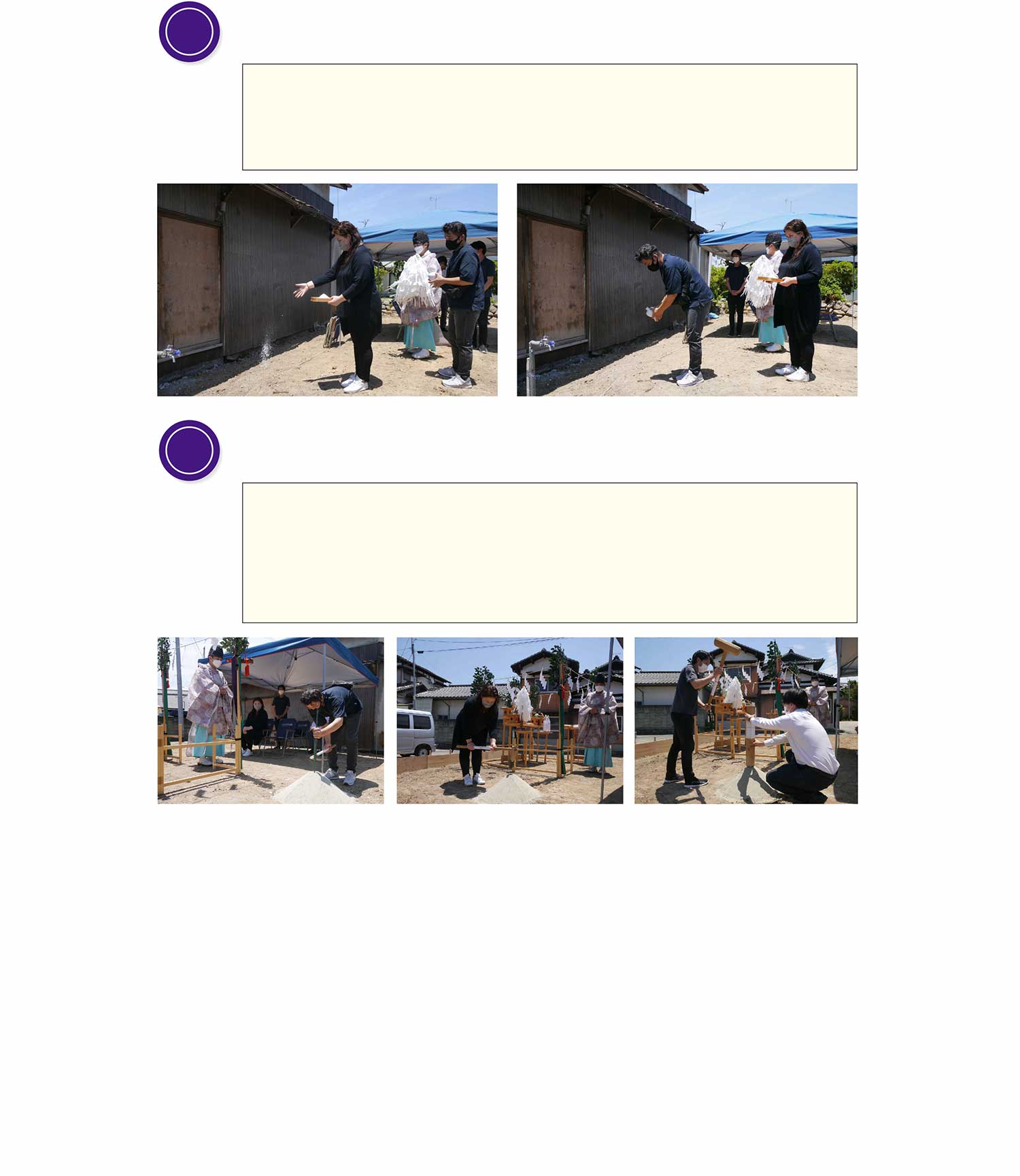 四方祓いを行います。敷地の四隅にお神酒、お塩を撒いて祓い清め、ご主人様がお神酒を撒き、奥様がお塩を撒いて清めます。
