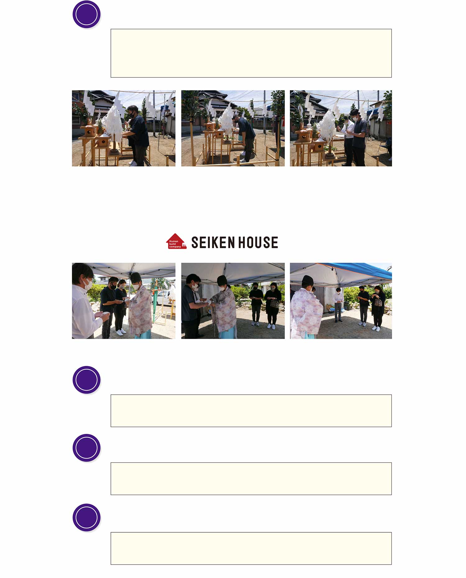 また、地鎮(じちん)とは地鎮(とこしずめ)とも言い、米・塩・切麻(きりぬさ)を土地の四方に散供(さんく)し、忌鎌(いみかま)、忌鍬(いみくわ)、忌鋤(いみすき)により刈初(かりぞめ)、穿初(うがちぞめ)を行い、鎮物(しずめもの)を埋納(まいのう)して土地の神霊を和め鎮めるために行うのでセイケンハウスでは家づくりに大切と考えているのです。