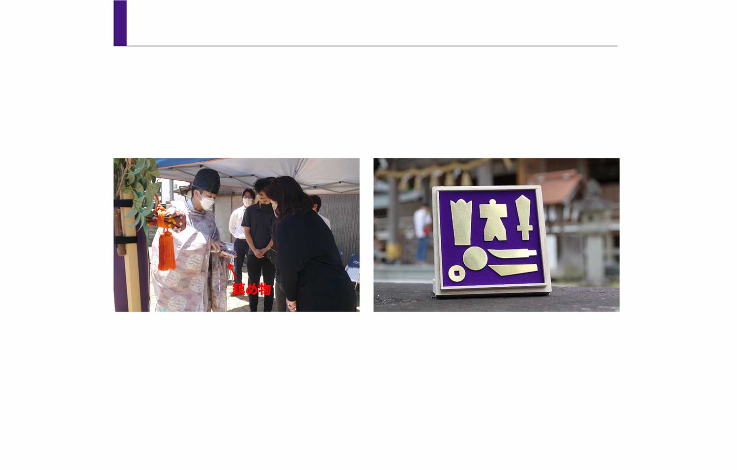 地鎮祭が終わると、神主さんから『鎮め物』と『棟札』のご説明をいただきます。『鎮物』は、基礎工事の際に下に埋めるもので、『上棟札』は、棟上げの際に棟木に納めます。