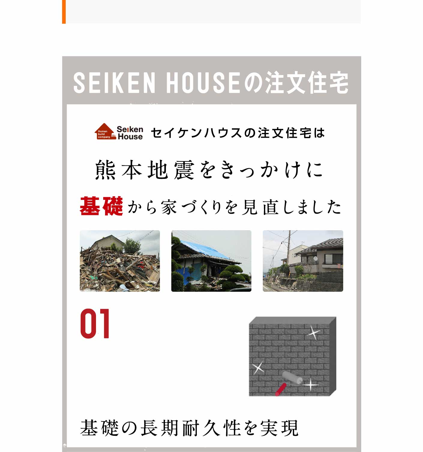 2階から落としても割れない程の強度。基礎工事の「ホームメイキャップ塗装」を採用。外観の美観を整えるだけでなく、コンクリートの中性化を実現。地震などの外力による破壊を防ぎます。