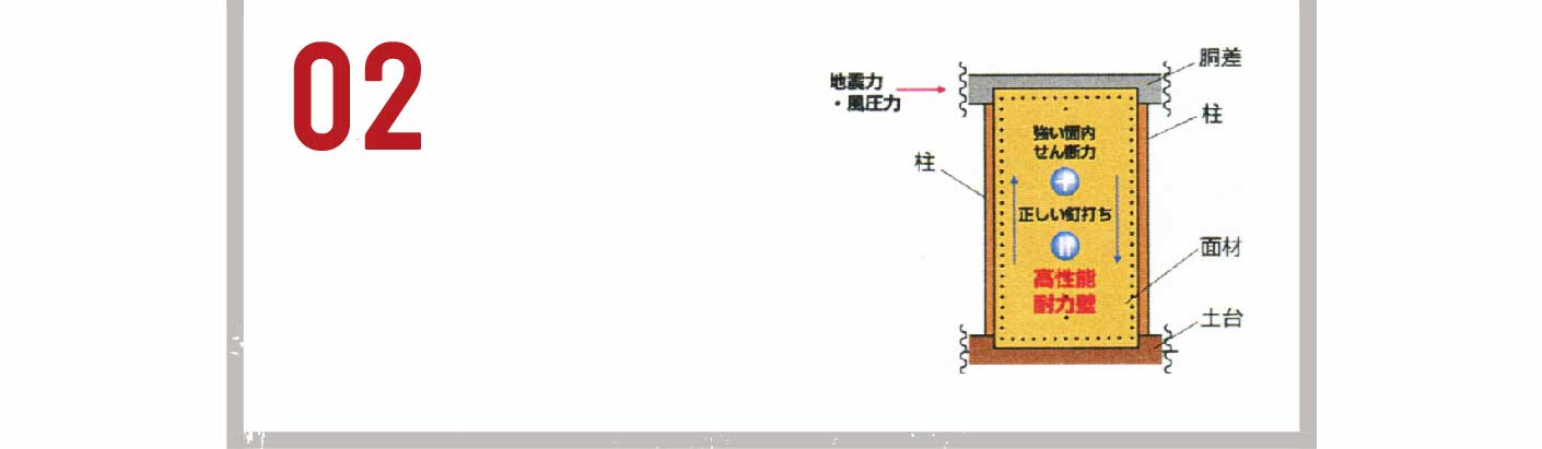 壁倍率4.0の高耐震・高耐久。面材工法により、壁面全体で地震力.風圧力を受け止め、バランスよく分散し、軸組の接合部への力の集中を緩和します。