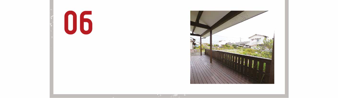 “マニルカラ”という、水中でも使用できるほど耐久性に優れた超硬質のデッキ材を採用。長い庇(ひさし)が日射を遮り心地よい半屋外空間を実現します。