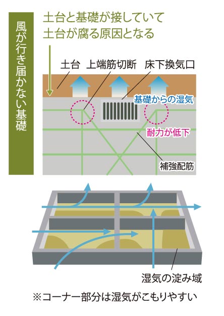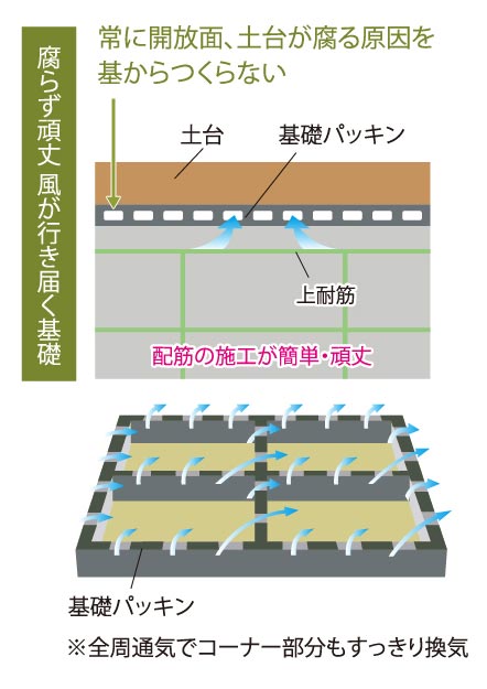 自然の風が床下全体を走り、木を活かす「基礎パッキン工法」