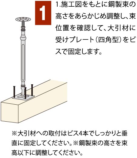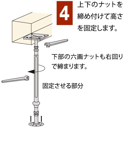 従来の木の束の場合、大工さんが長さを決めて取り付けた後は、床の水平の微調整はできませんでした。ですが、鋼製束の場合、束の中央部分を回転させると高さが上下し、簡単に高い精度で床の水平を出すことができるようになりました。